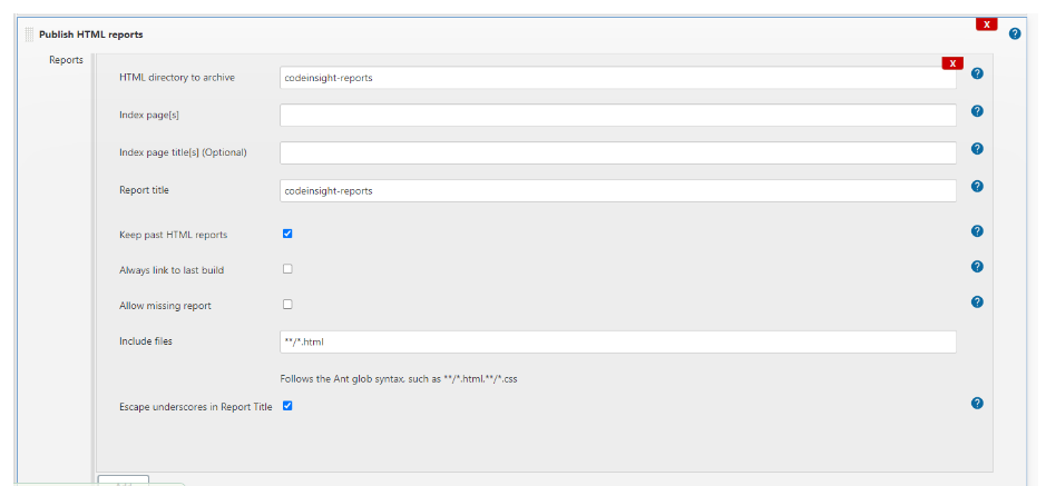 To configure the publication of the Code Insight report once it is sent to Jenkins post-build, go the Post-build Actions section of the build scan job and open the Build HTML reports page.