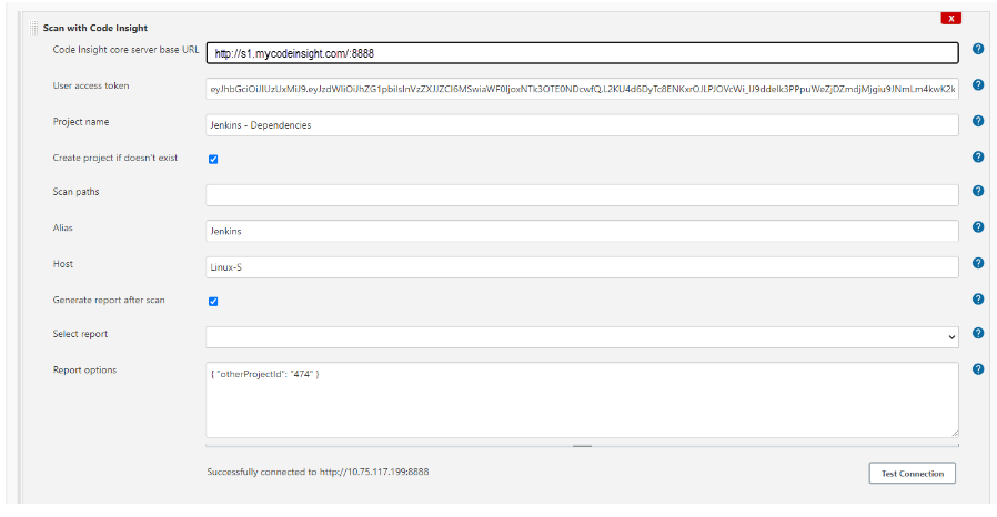 9. If you have not configured report generation (see the previous step), click Test Connection to test your connection to Code Insight.