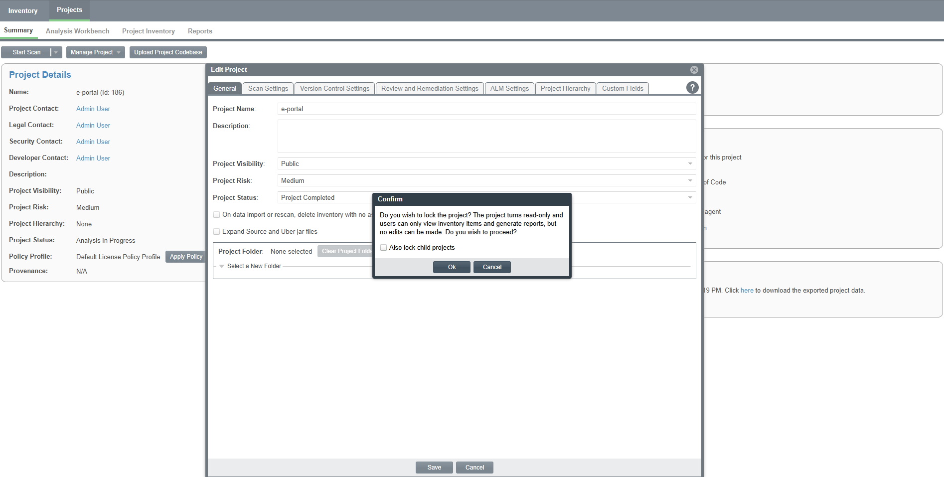 Starting in this release, Code Insight introduces the ability to lock a project once it reaches its completion status, preventing any further modifications. In this enhancement, when you select the Project Completed status from the Project Status dropdown list in the General tab on the Edit Project window, a dialog box named Confirm appears. This dialog box allows you to confirm the project locking action and to optionally include associated child projects in the locking process. Selecting the check box labeled Also lock child projects on this dialog box allows you to lock all associated child projects along with the parent project.