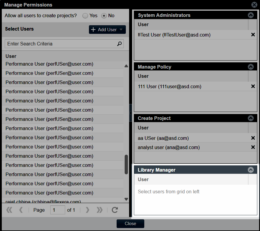 By adding required users—using the Add User field in the Manage Permissions dialog—to the Library Manager section, you can grant them permissions to create and edit custom components and custom licenses, as well as to create, edit, and delete custom detection rules as required. Only users with the Library Manager role have the authority to manage the custom components, custom licenses, and custom detection rules.