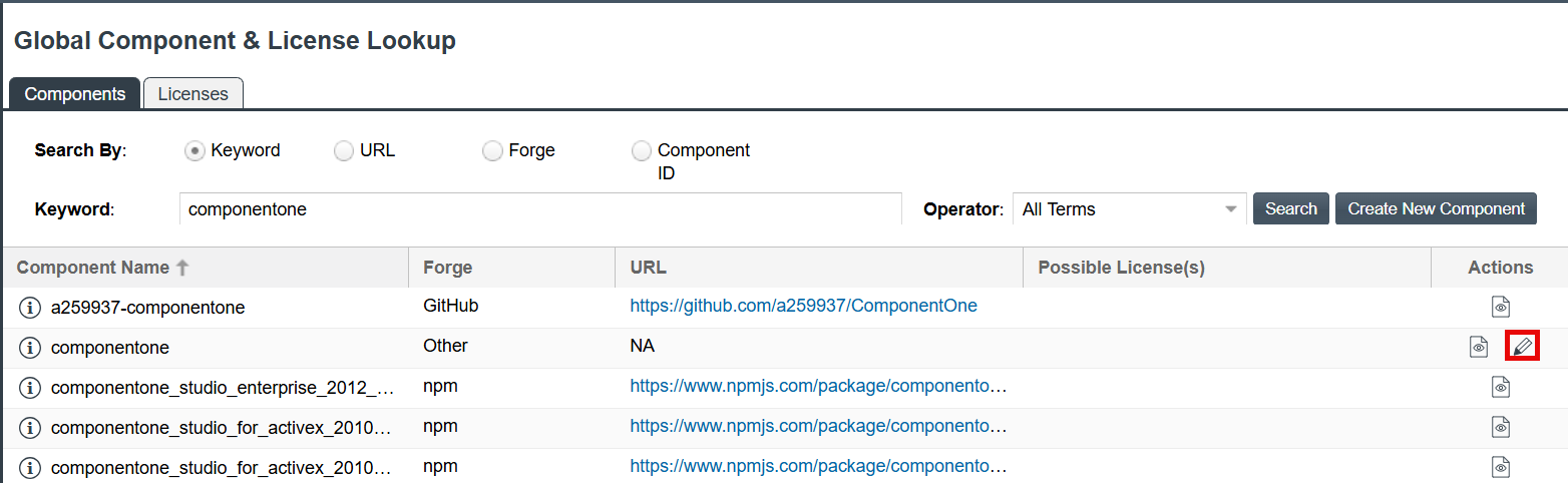 The following procedure describes how to edit a custom component using the Global Component & License Lookup feature. (See Editing a Custom Component for background information about this editing process.)