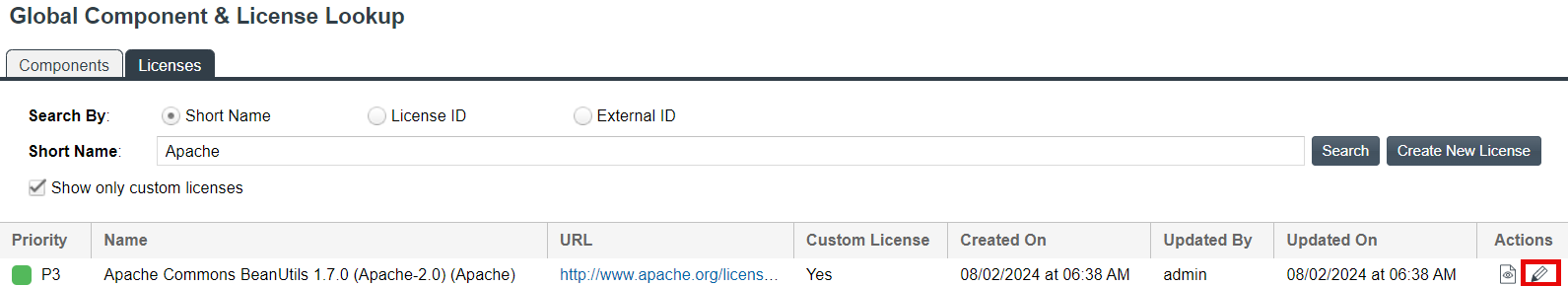 Editing a Custom License While Searching Licenses with the Global Component & License Lookup Feature