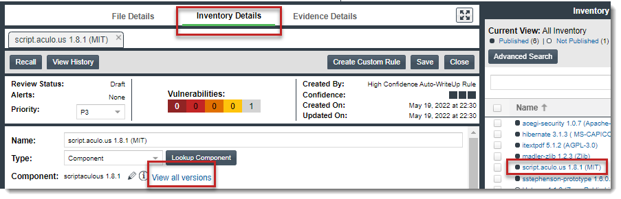 On the Inventory Details tab, locate the Component field and, next to the item’s component name and version, click View all versions.