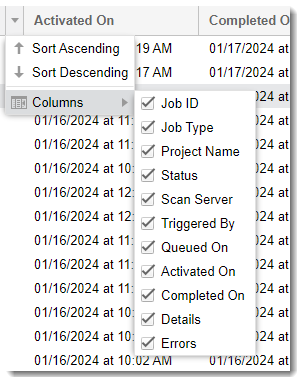 2. Move the cursor to the Columns option in the menu. The list of all columns available in the Jobs queue is displayed to right of Columns.