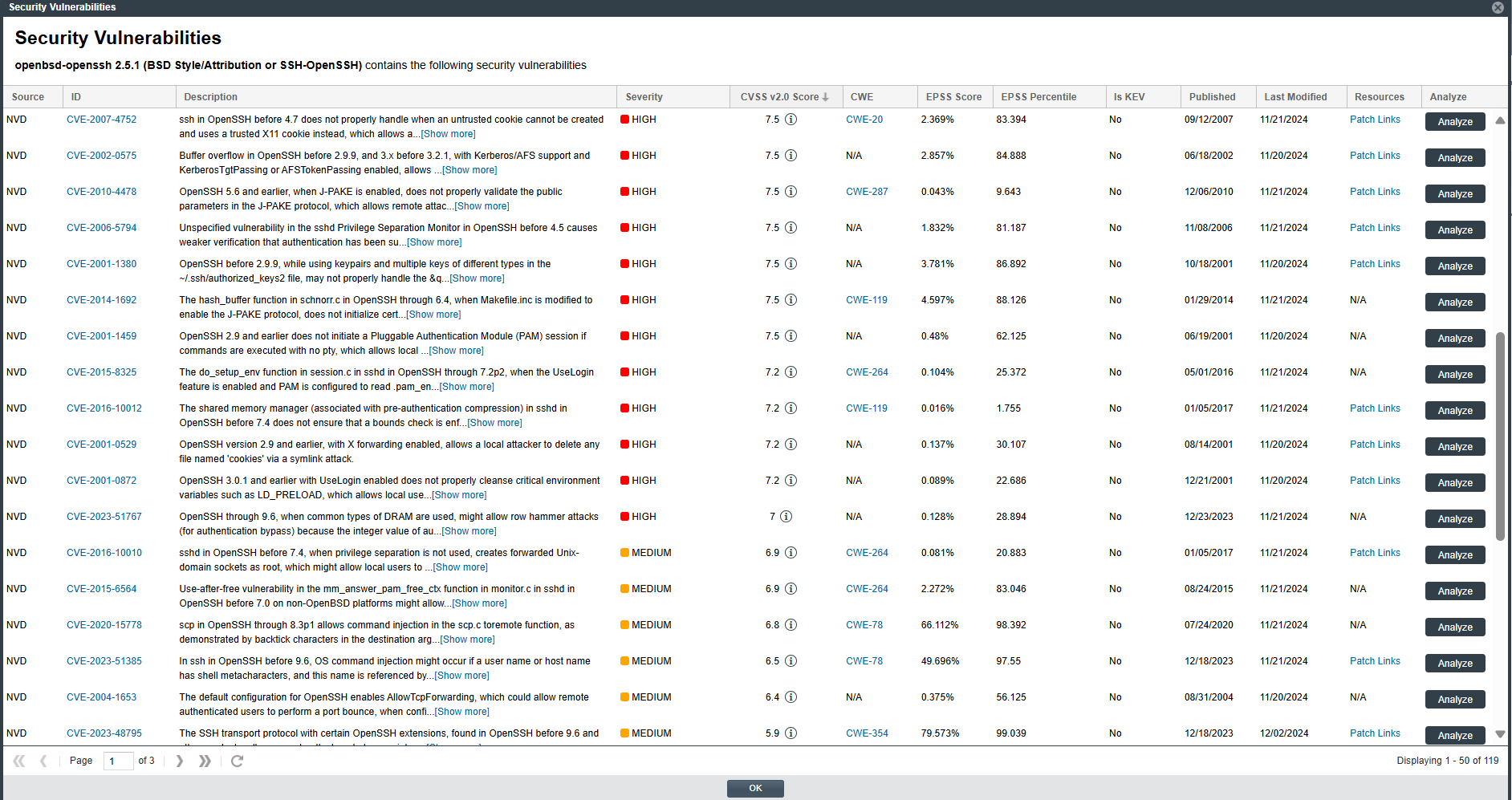 For a description of the details shown for each vulnerability listed, see Security Vulnerabilities Window.