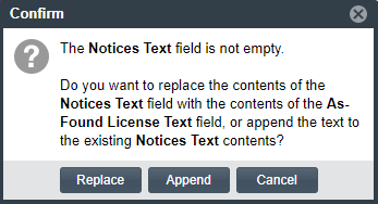 If the Notices Text field is not empty, you are given the option either to append the As-Found License Text content to the existing Notices Text content or to replace all the existing Notices Text content with the As-Found License Text content.