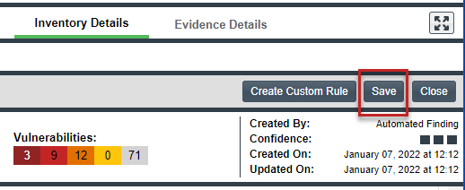 If you are in the Analysis Workbench, click the Save button at the top of the Inventory Details tab. (Alternatively, click Close to shut down the tab for the current inventory item. You are prompted to save the inventory changes before the tab closes.)