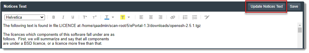 If the Notices Text field is empty, the As-Found License Text content is copied to the Notices Text field, with the formatting preserved.